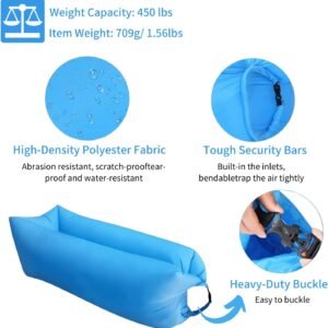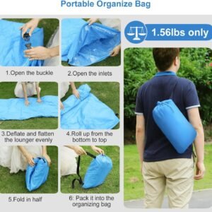 ✔ EASY INFLATION – No pump required. Just whisk the inflatable couch through the air to inflate. The little trick is that you need to trap air by closing the sleeve opening before the end of each movement, and keep the mouth closed until you begin the next movement.