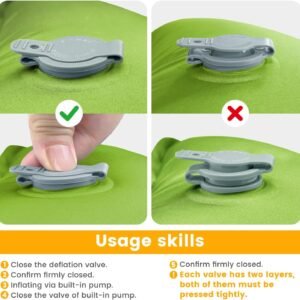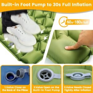 - 2. 30s Inflation Full & 1s Deflation & 24-Hour Air Keep. Single-foot pump fills the camping mattress pad in 30 seconds (tested to be 5x+ faster than hand or mouth pump style). Inflation method: Open the inflation valve, one foot steps on it, and by continuously stepping down and lifting your foot, allow air to enter the sleeping pad, achieving rapid inflation. Saves effort and protects your back. No-leak valve design keeps the inflatable sleeping pad fully inflated for 24 hours—no need to refill at night. Sleep uninterrupted. Open the valve on the camping sleeping mat back, and air instantly escapes.